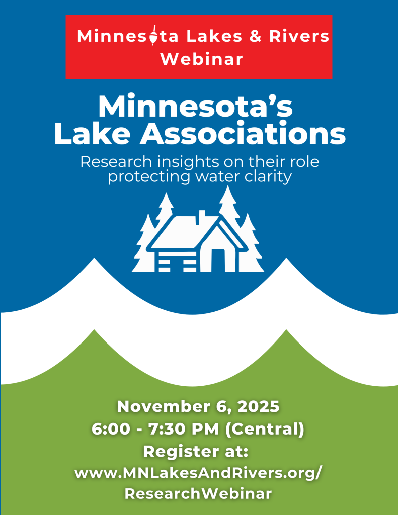 Join us for a conversation on the evolving role of lake associations in shaping Minnesota’s water future. This webinar will share new research insights from a statewide survey of lake association leaders—revealing how they’re building partnerships, advancing science-based practices, and mobilizing residents to take collective action for clean water.